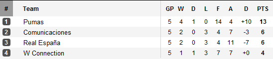 Comme dans les autres groupes, le club mexicain du groupe D se promène. Les Pumas possèdent 7 points d’avance sur leur dauphin et termineront donc à la première place du groupe. Derrière, l’indécision domine. La victoire de Real España devant Comunicaciones ayant totalement relancé le groupe, c’est une finale à trois qui se prépare pour l’ultime journée. Si les guatémaltèques de Comunicaciones sont actuels détenteur du précieux sésame, ils devront s’imposer devant les Pumas lors de la dernière journée. Car seulement 2 points le séparent du dernier du groupe, les trinidadiens de W Connection qui accueilleront la veille Real España, actuels 3e à égalité de points avec Comunicaciones.