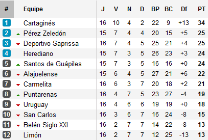 Nous avions laissé le Verano 2013 aux mains de Cartaginés, un mois et demi plus tard, le Brumoso reste loin devant. Meilleure défense du tournoi, les hommes de Javier Delgado s’impose la semaine dernière face à Herediano (dans un match marqué par les débordements racistes en tribune) et concèdent deux points en milieu de semaine face à San Carlos. Sans conséquences particulières, Caraginés dispose d’un coussin de 9 points d’avance sur son premier poursuivant Pérez Zeledón.
