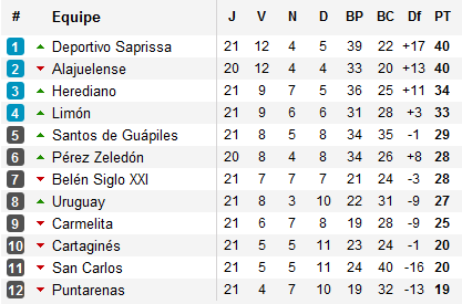 Car en tête du tournoi, le duel Saprissa – LDA bat son plein : accroché par Santos, la ‘S’ voit revenir sur elle la LDA qui n’a fait qu’une bouchée de Puntarenas, lanterne rouge du tournoi. Derrière, Herediano est accroché par Belén alors que Limón attend les derniers instants de la rencontre pour faire tomber Pérez Zeledón et assoir sa quatrième place. Conséquence, les Guerreros del Sur sont à cinq points : sans un succès à Alajuelense, la dernière journée de la phase régulière n’aura d’autre enjeu que de déterminer les affiches opposant les quatre premiers actuels.