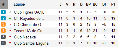 Troisième résultat nul pour Tigres qui marque un sérieux coup d’arrêt après un départ en boulet de canon. Si la première place reste la propriété des Tigres, Monterrey continue de se rapprocher. Nouvelle victoire, la troisième consécutive pour les Rayados qui s’imposent devant América et pointent désormais à une longueur du leader avant d’aller défier Toluca. Si le champion sortant est plus que jamais dans la course, le finaliste n’en finit plus de chuter. Après la fin en eau de boudin de l’ère Romano (viré pour avoir insulté les supporters), Santos Laguna offre à son nouvel entraîneur, le pire départ de l’histoire d’un coach Guerrero à avec une quatrième défaite consécutive. Santos compte désormais dix points de retard sur le leader du groupe.