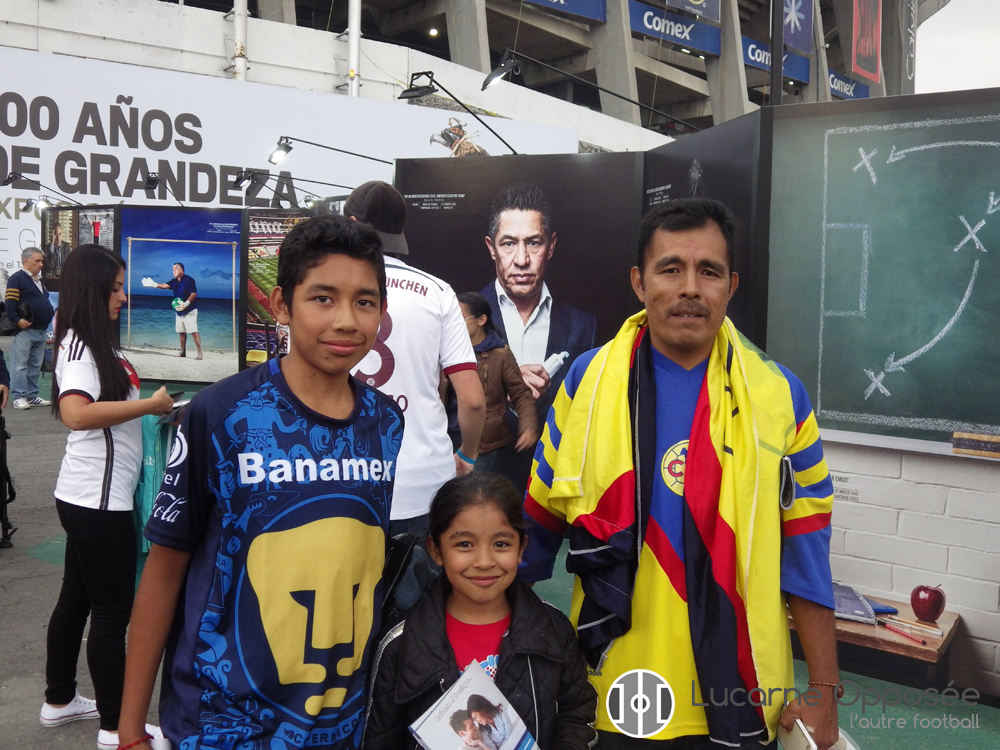 Trois heures avant le coup d’envoi, le monde commence à se presser en attendant l’ouverture des grilles, l’occasion de prendre une photo avec la mascotte, où d’aller faire un tour dans la boutique officielle estampillée Nike. Fans des Pumas et des Águilas se croisent dans une ambiance bonne enfant où se mélangent les genres et les générations. La pluie annoncée et l’horaire tardif du match n’empêchent pas de venir en famille. Bien au contraire. A l’intérieur du parvis, les hôtesses aux courbes parfaites se préparent à accueillir les supporteurs sous le son des enceintes. Chaque sponsor a droit à son stand et à ses animations. La proximité avec les USA doit être pour beaucoup dans cette optimisation du marketing qui ferait rêver la FIFA et l’UEFA pour un simple match de championnat national. Au milieu une exposition de photos remémore les moments de gloires du Club América depuis 1916. Même si nous sommes du côté de l’entrée Águilas, les maillots bleu et or des Pumas côtoient les maillots crèmes ou jaunes de l’América, parfois même au sein de la famille. C’est justement cette « trahison » apparente de certains membres de la famille que nous allons chercher à mieux comprendre.