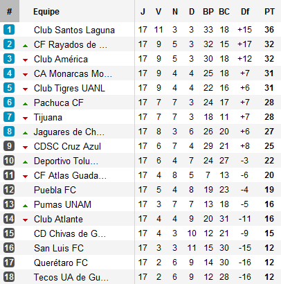 Ne restait donc plus qu’à définir le classement final. Les Monarcas battus, América accroché, seul les Tigres pouvaient encore espérer devenir Superlíder. Encore fallait-il s’imposer à domicile devant Puebla, ce que les Tigres n’auront réussi à faire, encaissant deux buts dans les cinq dernières minutes. Santos Laguna pouvait donc tranquillement conclure l’affaire en s’imposant à Atlas. Les Guerreros terminent avec quatre points d’avance sur le second Monterrey et devront donc tenter de vaincre la terrible malédiction du Superlíder (à 19 reprises, le Superlíder a été éliminé d’entrée de Liguilla, seuls Toluca et Pachuca étant parvenu à remporter une Liguilla après avoir été Superlíder depuis l’instauration du format actuel en 1996).