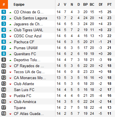 Car la lutte pour la Liguilla reste tout aussi intense. Dernier qualifié à l’heure actuelle, Querétaro , huitième, ne compte qu’un point d’avance sur Toluca, deux sur le quatuor Monterrey – Tecos – Monarcas – Atlante, trois sur San Luis, quatre sur Puebla. Si tout espoir est mort pour Atlas, si Tijuana et América conservent un ultime espoir, à trois journées de la fin, ils sont encore 15 à lutter pour le titre.