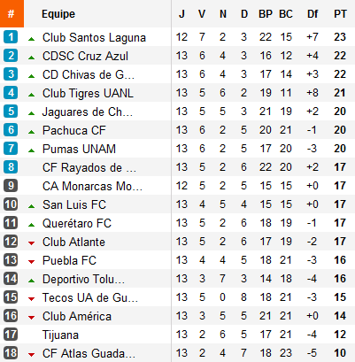 Conséquence, 13e journée et nouveau leader : Santos Laguna. Les Guerreros et leur buteur Oribe Peralta signent un cinquième succès consécutif en disposant dans les derniers instants de Toluca (but signé Christian Suárez) et s’emparent de la tête, disposant d’un bonus potentiel avec leur rencontre de retard à disputer face aux Monarcas.