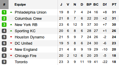 Sans jouer, Philadelphie conserve sa première place à l’Est. Mais celle-ci ne tient désormais plus qu’à un fil. Et le principal concurrent n’est pas New York mais Columbus. Sauvés par le 11e but de Thierry Henry, plus que jamais meilleur scoreur de la ligue, les Red Bulls ne peuvent faire mieux qu’un résultat nul devant Dallas et voient ainsi Columbus lui passer devant. Le Crew dispose des Timbers sur la plus petite des marges mais en profite donc pour revenir sur Philadelphie, un point devant New York. Les Zolos restent en tête et disposent de deux matchs de retard sur Columbus, quatre sur New York, pour prendre le large. La position des Red Bulls semble délicate. Avec ce quatrième match sans succès, New York voit aussi se rapprocher le Sporting Kansas. Tombeur de Toronto, le Sporting revient à quatre longueurs des Red Bulls avec trois matchs de plus à disputer. A l’heure actuelle, New York possède le dernier ticket pour les play-offs mais un retour de Kansas City pourrait mettre les Red Bulls sous la menace d’un tour préliminaire qui est encore loin d’être assuré.