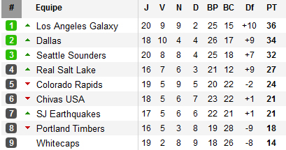 A l’Ouest, Los Angeles demeure la meilleure équipe de la MLS mais reste toujours sous la menace de Dallas qui pointe à deux longueurs avec deux matchs de plus à disputer. Derrière, Seattle prend la troisième place avec notamment trois succès lors des cinq derniers matchs, et double un Real Salt Lake qui grille petit a petit ses jokers (un seul succès en cinq rencontres) mais qui compte toujours quatre rencontres de retard sur ses concurrents (et pointe à neuf longueurs du Galaxy). Pour les nouveaux venus, l’embellie est retombée : Portland n’a plus gagné depuis fin mai (soit six défaites lors des 7 derniers matchs) alors que Vancouver, malgré un excellent Eric Hassli, reste bon dernier. A noter que les Whitecaps ont décidé de se séparer du français Mouloud Akloul, tout juste incorporé dans l’effectif (8 matchs disputés). De grandes manœuvres devraient avoir lieu à Vancouver à partir du 15 juillet.