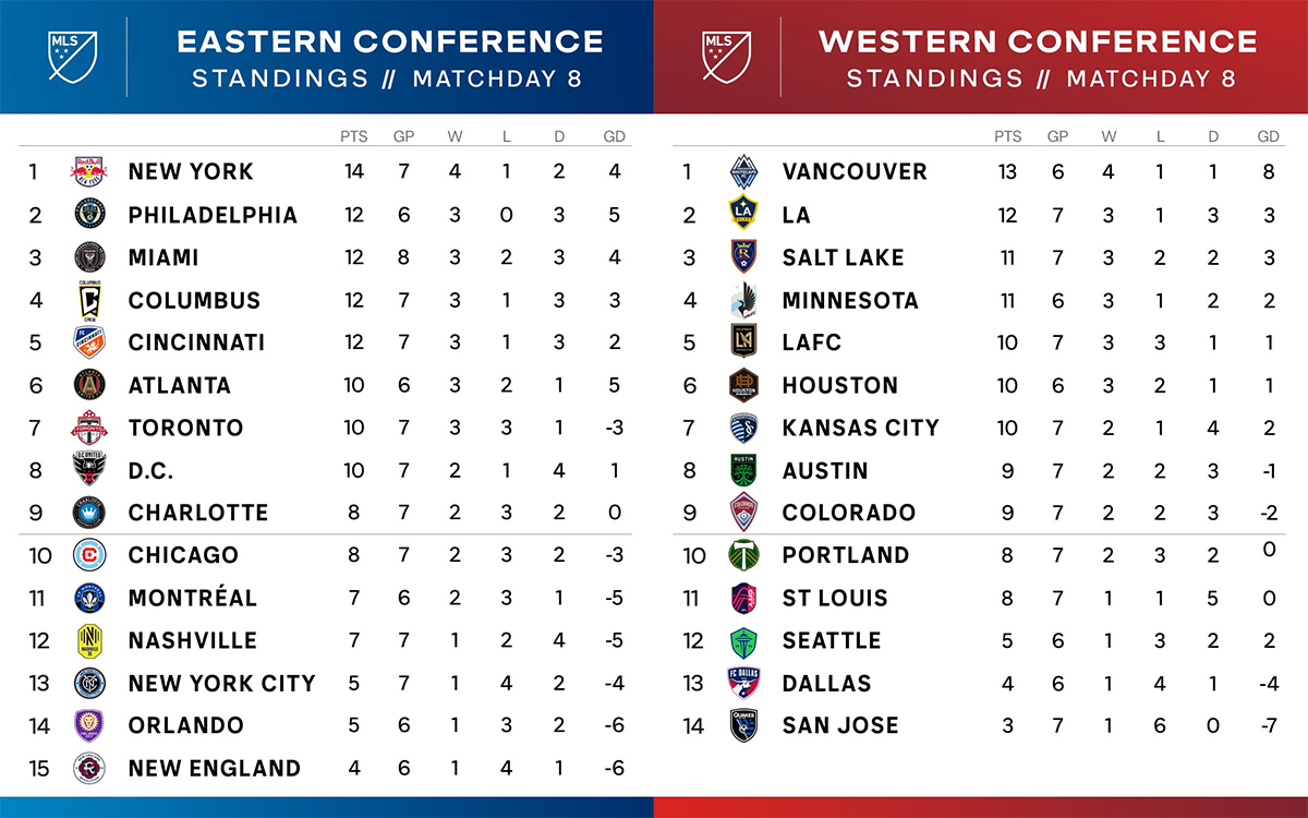 Dans les autres match Colombus et DC ne sont pas parvenus à se départager, Vancouver s’impose largement contre Toronto, New England prend le dessus sur Charlotte par la plus petite des marges. NYCFC et Atlanta se quittent sur un match nul, Cincinnati est défait pour la première fois de la saison contre NY Red Bulls, désormais leader à l’Est. L’Inter Miami enregistre le retour de Lionel Messi qui a disputé la seconde période, mais n’a pas été suffisant car les Hérons ont fait match nul contre les Rapids. Austin finit par s’imposer contre les Earthquakes au bout d’un match à rebondissement où la franchise de San José pensait tenir sa deuxième victoire de la saison. Ils s’enfoncent tout doucement au classement et devront faire attention à la relégation. Minnesota et Salt Lake se neutralisent pendant que Chicago s’imposait contre Houston grâce à un magnifique but de l’inévitable Brian Gutiérrez. St.Louis et Dallas se quittent sur un match nul et vierge, les Sounders réalisent le carton de la soirée contre Montréal qui n’a toujours pas joué un match à domicile depuis le début de ce championnat. L’usure mentale se fait certainement sentir. Enfin, Kansas City et Portland se quittent sur un match emballant au niveau du score, mais aucune de ces deux équipes n’est parvenu à prendre le dessus sur l’autre.