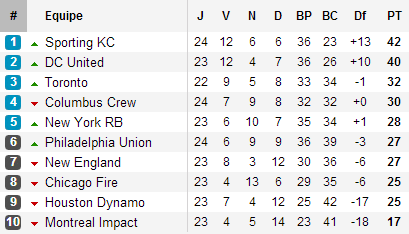 A l’Est, le duel Sporting Kansas – DC United se poursuit, les deux leaders ayant décidé de synchroniser leurs performances. Lorsque le Sporting ne prend qu’un point en deux rencontres, DC n’en prend pas avant que tous deux se remettent en marche, le premier en passant 4 buts à Toronto, le deuxième en en passant 4 à Colorado. Les deux premières places semblant d’ores et déjà réservées, la lutte pour la troisième et dernière place directement qualificative pour les demi-finales de conférence pourrait bien ne pas encore être totalement close. Car si Toronto reste cramponné à cette place, Columbus n’a pas encore rendu les armes. En écrasant Los Angeles 4-1 lors de la semaine 23, le Crew revient à deux points du TFC (avec deux matchs de plus) et fait l’une des belles affaires de la semaine. Derrière, les Red Bulls de Thierry Henry s’accrochent comme ils peuvent à la cinquième place. Avec une victoire, deux nuls et une défaite lors des cinq derniers matchs, New York accuse le coup et ne parvient pas à décrocher Philadelphie, New England ou Chicago au bilan pourtant pas si flatteur. Comme si le suspense n’était pas assez intense, un autre candidat, spécialistes des retours au meilleur des moments, semble avoir appuyé sur l’accélérateur. Avec deux victoires lors de ses deux derniers matchs à domicile, Houston est revenu dans la course, à trois points de New York. Autant dire que si le Dynamo parvient à enfin savoir voyager (chose loin d’être gagnée vu les statistiques : 1 victoire (à Chivas), 1 nul (à Philadelphie) et 9 défaites), il pourrait bien venir coiffer tout le monde sur le fil. La seule certitude à l’Est est finalement que Montréal ne disputera pas les play-offs. Malgré la première victoire depuis près de 2 mois (dernier succès précédent le 30 juin), victoire qui intervient pour la première d’Ignacio Piatti, on voit mal comment la plus mauvaise équipe de la MLS parviendra à remonter 11 points en 11 match, surtout quand elle n’en a pris que 17 jusqu’ici.