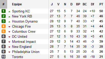 Evènement de la semaine à l’Est, Columbus et son intenable Federico Higuain (homme de la semaine pour la deuxième fois de rang), met fin à la série de l’Impact et relègue la nouvelle franchise à trois points (avec deux matchs de plus disputés pour les montréalais). Le Crew signe quatre victoires consécutives avant de s’effondrer la nuit dernière lors des premières rencontres de la semaine 27. Mais la lutte pour les play-offs reste intense. Si le Sporting Kansas plane toujours sur la conférence, derrière, New York, accroché pour la seconde fois consécutive suite à une nouvelle sortie manquée de son gardien Bill Gaudette, ne compte que cinq points d’avance sur le sixième et premier non qualifié, DC United. Entre les deux, Chicago dispose encore d’un match de plus pour prendre la seconde place de la conférence. Derrière, New England, Philadelphie et Toronto semblent d’ores et déjà hors course.