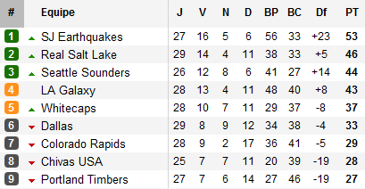 A l’Ouest, pendant que San José domine, les positions se resserrent. Les Earthquake atomisent Chivas et comptent désormais sept points d’avance sur le Real Salt Lake avec deux matchs de retard. Derrière les Royals, le rythme de Seattle et de Los Angeles ne faiblit pas. Les Sounders sont accrochés à Dallas pendant que le Galaxy, qui vient de signer Christian Wilhelmsson, s’imposent tranquillement devant un Vancouver à la dérive sur deux buts superbes signés Juninho et Beckham. Les Whitecaps enregistrent leur quatrième défaite de rang et s’exposent désormais à un retour de Dallas.