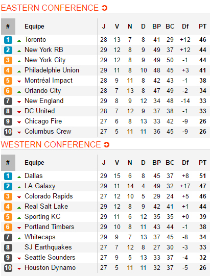 Reste donc que tout est encore ouvert dans cette conférence, à tous les niveaux. Si Toronto mène la danse, l’avance des Reds sur les frères ennemis de New-York parait minime mais pourrait s’accroître en cas de victoire du TFC dans son match de retard sur les deux grosses pommes. La bataille de New-York pourrait bien profiter à Philadelphie voire à Montréal, si l’Impact a la bonne idée de s’imposer lui aussi dans son match de retard. Attention tout de même au réveil de New England qui reste sur deux victoires et reste en embuscade collé aux basques d’Orlando, actuel sixième.