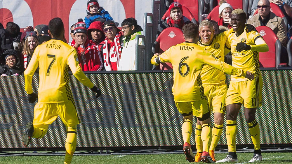 La première surprise est la rencontre inaugurale opposant le champion en titre, le Toronto FC, à son rival américain, le Crew de Columbus. Le Crew arrivait au Canada après une élimination douloureuse face aux champions en titre, un déménagement plus que probable au Texas et un effectif qui avait vu ses meilleurs éléments exiger un transfert. Bref, rien n’allait chez les hommes de Greg Berhalter, tandis que chez les Canadiens, la confiance régnait avec un seul départ notable, celui de Steven Beitashour qui avait été réglé de brillante façon avec l’arrivée de Gregory Van Der Wiel, l’ancien du PSG. Pour espérer créer la surprise, le Crew arrivait organisé en 4-2-3-1 avec un excellent duo au milieu, Artur et Trapp, tandis que Gyasi Zardes se voyait décerner les clés de l’attaque, aidé par le vétéran Federico Higuaín derrière lui. Le TFC, lui, débutait avec un 4-4-2 en diamant avec les premières titularisations de Van Der Wiel et Ager Aketxe. Rapidement, on sentait que les Reds étaient plus à l’aise avec le ballon, Giovinco et Altidore étaient dangereux. Cependant, c’est le Crew qui avait la première occasion franche de la rencontre lorsque Cristian Martinez, espoir du club qui avait été prêté à Pittsburgh en USL l’an dernier, était lancée par Federico Higuaín dans un 1 contre 1 avec Eriq Zavaleta, mais malheureusement pour lui, sa frappe touchait le poteau droit avant de sortir en dehors des lignes. Plus les minutes défilaient et plus que Columbus se sentait à l’aise. Défensivement, la charnière Mensah-Abubakar était pratiquement inébranlable et lorsqu’il y avait un trou qui se créait, Zack Steffen était sur le coup. Tout juste avant la mi-temps, Artur effectuait une excellente passe lobée sur les côtés pour Milton Valenzuela qui centrait rapidement pour Federico Higuaín. L’Argentin ne manquait pas pareille occasion et sa volée terminait dans le fond du filet. Le Crew menait 1-0 après 45 minutes de jeu. Toronto pouvait s’en vouloir ayant été 70% du temps dans le territoire adverse, mais le Crew malgré de maints revirements, tenait bon avec une défense qui semblait inébranlable quoique chanceuse parfois. Dès le retour des vestiaires, Columbus cassait les festivités au BMO Field, car à la 46e minute, Pedro Santos effectuait une passe exceptionnelle pour Gyasi Zardes qui ouvrait le compteur des buts pour sa nouvelle équipe à l’aide d’un tir ras de terre qui laissait Alex Bono sans mot. Pour le reste de la rencontre, Toronto allait tenter de revenir dans la rencontre sans pour autant percer l’énigme de la charnière ghanéenne. Résultat final 2-0 pour Columbus qui gagne au BMO Field pour la première fois depuis le 17 octobre 2015 à l’époque, Joe Bendik avait accordé deux buts à Columbus.