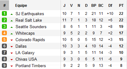 A l’Ouest, si Los Angeles est largement en retard avec déjà 5 défaites en 9 matchs, le week-end aura vu le leader San José tomber à son tour. Les Earthquake concèdent la défaite à Vancouver sur un but d’Eric Hassli inscrit au bout des arrêts de jeu. Ce succès permet aux Whitecaps de revenir à cinq longueurs (avec un match de moins). Mais ce revers profite également à deux autres équipes. Mené au score, puis renversant la situation sur un doublé de Saborío avant de se retrouver en infériorité numérique, le Real Salt Lake revient à la hauteur des Earthquake. De son côté, Seattle domine Philadelphie, signant ainsi un quatrième succès consécutif, et revient à trois points avec deux matchs de retard. Le Seattle – Salt Lake de dimanche s’annonce passionnant.