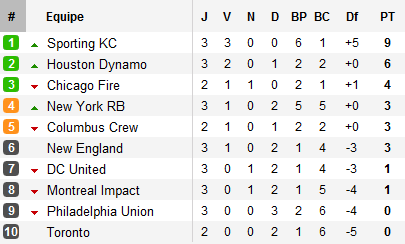Si l’Est marque toujours moins de points que l’Ouest (45 à 30 pour l’Ouest), le Sporting Kansas reste seul avec trois victoires en trois matchs. Dernière victime en date, le FC Dallas qui se présentait au Livestrong Sporting Park encore invaincu. Si le brésilien Ricardo avait réussi à ouvrir la marque pour les visiteurs, le Sporting égalisait peu avant la pause par son français Aurélien Collin. Puis, en fin de rencontre, l’inévitable Kei Kamara inscrivait le but libérateur synonyme de première place de la conférence Est pour le Sporting. Seul en tête, la club de Kansas City compte trois points d’avance sur Houston tombé à Seattle, cinq sur Chicago, six sur le trio New York, Columbus, New England, qui a fêté sa première victoire de la saison (avec un doublé de Thierry Henry pour les Red Bulls et un but dès la 28e seconde pour Saër Sene, jeune français passé par la réserve du Bayern, pour New England). Dans cette conférence, le départ est toujours aussi compliqué pour l’Impact, bien naïf à Columbus et les Zolos de Philadelphie, battus à Chicago et déjà dans la délicate situation que nombreux observateurs leur avait annoncée.