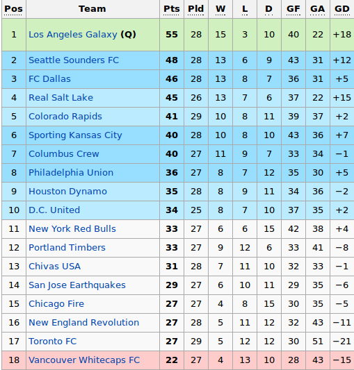 Comme la saison dernière, le Galaxy domine la saison régulière. Sur les mêmes bases que l'an passé, Los Angeles a d'ores et déjà composté son billet pour les playoffs alors qu'il ne lui reste que 5 matchs à disputer. Dernière victime, le champion sortant Colorado, tombé sur le 12e but de Landon Donovan qui rejoint ainsi Thierry Henry au sommet du classement des buteurs. Reste un objectif pour le club californien : conserver sa première place au classement général, place qui lui garantira un billet pour la CONCACAF Champions league 2013.
