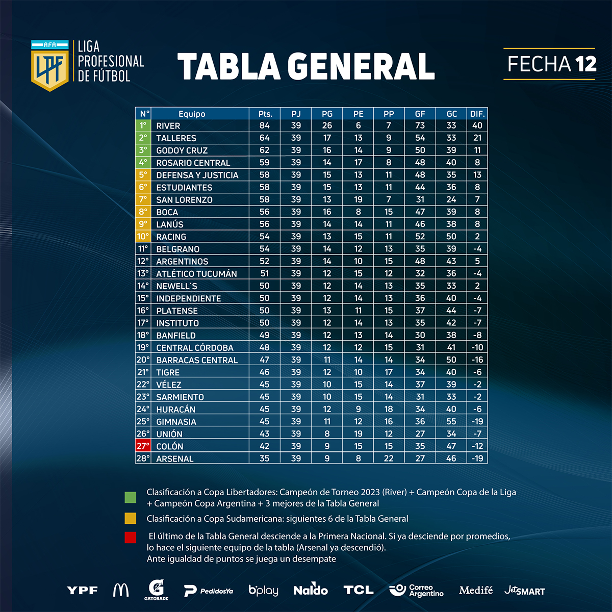 En ouverture de la journée, il n'y a pas eu de vainqueur à Sarandí entre Arsenal et Gimnasia, mais à Tucumán, ce fut une autre histoire. Malgré un retard de 1-0, le Rojo de Tévez a renversé la situation en s'imposant à la 90+4e. Cela garantit officiellement le maintien d'Independiente en première division, une mission largement accomplie pour Tévez. L'objectif maintenant est de conserver une place qualificative (avec quatre points d'avance sur le cinquième, à trois journées de la fin) et d'aller le plus loin possible. La même histoire s'est répétée pour Instituto, qui a également sauvé sa place en s'imposant dans les dernières minutes à La Paternal. En revanche, pour Argentinos, c'est la catastrophe, avec un septième match sans victoire et une quatrième défaite consécutive. Entre temps, une immense surprise a éclaté. Vingt-et-un ans après, Huracán a réussi à s'imposer au Monumental face à River. Cela a été possible grâce à un but de Franco Alfonso, formé chez les Millonarios. Cette victoire a également mis fin à une incroyable série de vingt victoires consécutives à domicile pour River. Néanmoins, les hommes de Demichelis sont presque assurés de participer aux play-offs de la Copa et cette soirée a principalement été l'occasion de dire au revoir à Enzo Pérez. Pity Martinez a marqué son premier but depuis son retour, d'un magnifique coup-franc. En ce qui concerne le Globo, il a été très efficace en convertissant ses deux seules occasions. Ces trois points étaient sans doute inespérés et font un bien fou : ils permettent à Huracán de s’offrir trois points d’avance sur Colón, désormais seul relégable. Car si Unión a bien failli battre Lanús juste avant le coup de sifflet final, un arrêt exceptionnel d'Acosta privant le Tatengue d’une victoire qui lui aurait donné de l’air, Banfield s'impose à la 90+2e, et pousse ainsi Colón à l’avant-dernière place de la table annuelle.