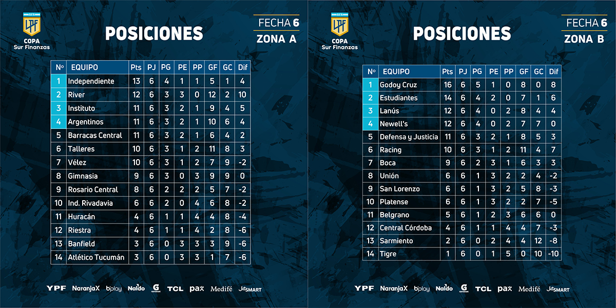 À suivre aussi ce week-end le clásico entre un San Lorenzo toujours aussi poussif mais qui a enfin gagné un match lors de l’ultime journée face à un Tigre à la dérive (aucune victoire, aucun but inscrit, un seul point pris en six sorties) et un Huracán guère plus réjouissant, aucune victoire autre que celle en ouverture face à un Banfield qui n’avance d’ailleurs toujours pas. À suivre aussi les dynamiques de Vélez et Lanús, trois victoires de rangs et qui recevront ce week-end pour continuer à se rapprocher de la tête de leur groupe.