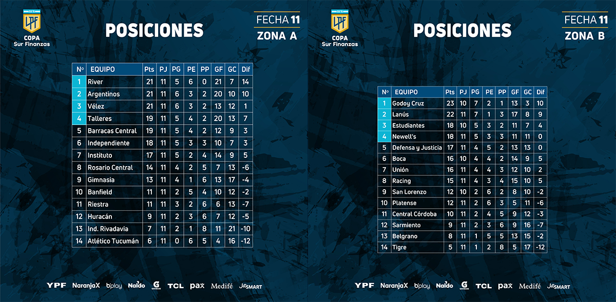 Une Zona A qui voyait River accueillir Gimnasia au Monumental pour fêter la Supercopa. Après un pasillo de honor de la part des joueurs du Lobo qui a fait couler beaucoup d'encre, les Millonarios ont très logiquement remporté la rencontre face à un rival bien plus faible, qui avait pourtant frappé en premier. River reste donc l'unique équipe invaincue, la dernière défaite remonte au 11 novembre dernier face à Central, soit un total de dix-sept matchs sans défaite. À noter le premier but (golazo) professionnel d'Etcheverri. Mais bien qu’invaincu, River n’a pas creusé l’écart, bien au contraire. Argentinos a offert une leçon de football au champion en titre, Rosario Central (3-0) et reste donc à la hauteur du leader, accompagné d’un troisième larron nommé Vélez. Le Fortín, qui jusqu'il y a peu luttait pour le maintien, s'est imposé face à Instituto et reste dans le trio de tête de la Zone A restant sur une invincibilité de huit matchs et enchaînant trois victoires de rang. Une série que les hommes de Gustavo Quinteros testeront à Córdoba face à un Talleres qui n'a pas bien joué lors de la onzième journée mais a quand même réussi à rentrer de Banfield avec un point dans la poche et mène le wagon des poursuivants.