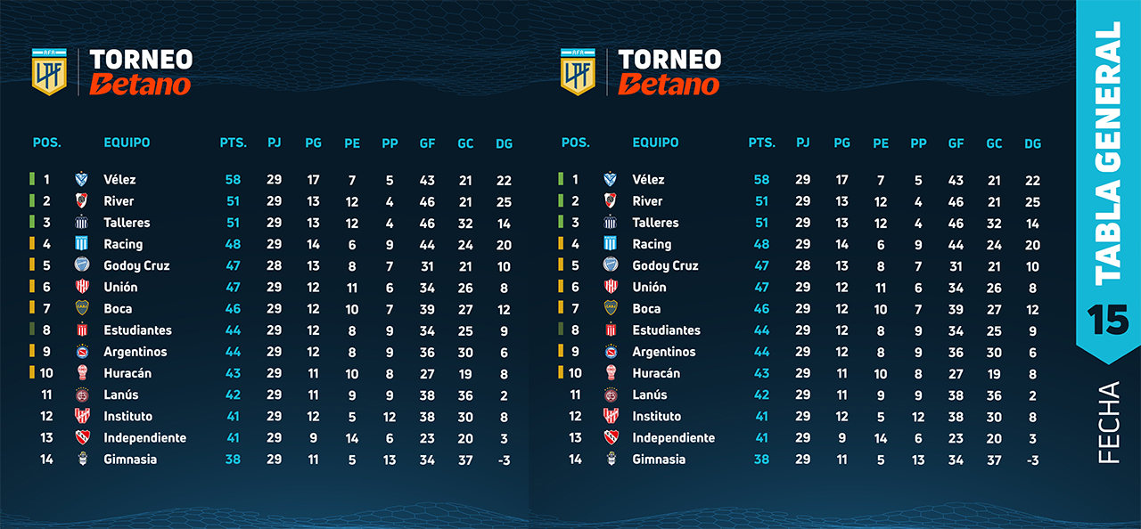 Loin de la folie de La Bombonera, il y a aussi un championnat qui se joue, Boca et River étant bien décrochés, le Millo étant certes désormais sixième, mais à neuf points de la tête. Une tête qui a un nom : Vélez Sarsfield. En quelques mois seulement, Gustavo Quinteros est ainsi parvenu à transformer une équipe qui jouait sa survie dans l’élite, prenait un 5-0 au Monumental, en une machine à victoires. Pour cela, il a misé sur un vrai mélange d’expérience – Braian Romero, Michael Santos, par exemple en attaque – et de jeunesse, symbolisée notamment par excellent Thiago Fernández ou encore les importantissimes Valentín Gómez et Christian Ordóñez, a totalement sécurisé ses lignes arrière, en installant définitivement Tomás Marchiori dans les buts – et de se souvenir de la gestion des gardiens lors des mandats précédents et sa conséquence. Et a bâti une équipe efficace et suffisamment intelligente offensivement, notamment par Claudio Aquino et Francisco Pizzini. Conséquence, Vélez a gagné neuf de ses dix derniers matchs, pour un nul, et s’est échappé. Derrière, Huracán, Talleres et Unión sont à six points, l’Atlético Tucumán qui coince un peu, à huit. Sans doute aussi une occasion de rappeler que laisser du temps à un entraîneur peut s’avérer payant, dans un championnat qui a déjà connu vingt-et-un changements d’entraîneurs en quinze journées, la palme allant à Defensa y Justicia, qui a usé quatre coaches pour pointer à l’avant-dernière position.