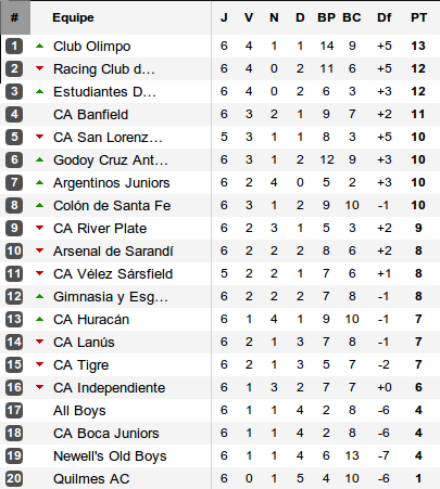 Pour revenir au sommet de ce tournoi de clôture, si Olimpo a pris la tête c'est que le Racing est tombé. Car l'autre belle affaire du week-end est pour Estudiantes qui s'impose au Racing dans les dernières minutes du choc au sommet sur un nouveau but signé Hernán Rodrigo López. Le haut du tableau reste compact avec les victoire de Colón, Godoy Cruz et Argentinos, seule équipe encore invaincue. Le trio, actuellement sixième, septième et huitième, n'est qu'à trois petits points d'Olimpo.