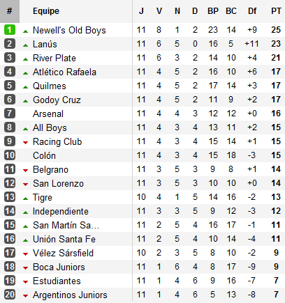 Derrière le trio, trois équipes à 17 points : Rafaela, Quilmes et Godoy, trois équipes à la lutte pour une place à Sudamericana (au général, ces trois équipes ne sont plus qu’à quatre et cinq points de Colón dernier qualifié). Plus loin, la situation d’Independiente frise la déprime : malgré la victoire face à Argentinos, le Rojo est de plus en plus proche de la Primera B.