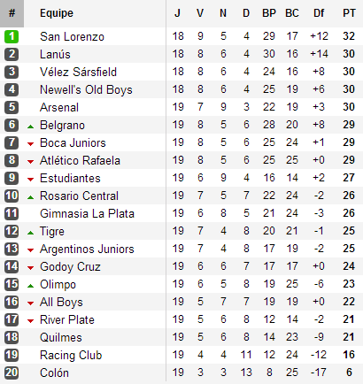 On n’aurait pu écrire meilleur scénario : quatre équipes, deux points, un titre en jeu. La dernière journée du Torneo Inicial a tout pour faire basculer ce tournoi au panthéon des meilleurs tournois de l’histoire du football argentin. Ils seront donc quatre pour deux matchs les opposant : San Lorenzo, leader mène la course avec deux points d’avance sur le trio Lanús, Vélez et Newell’s. Mais ces deux matchs auront bien d’autres conséquences pour un cinquième club : River.