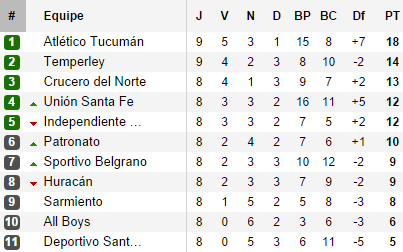 Comme dans le groupe A, le leader du B, Atlético Tucumán, a profité de la neuvième journée pour s’offrir quatre points d’avance sur son poursuivant direct. En s’imposant chez lui devant le Sportivo Belgrano de Juan Pablo Francia, le Decano profite des nuls concédés par la surprise Temperley face au grand spécialiste All Boys (sixième nul en huit matchs, le quatrième sans le moindre but) et celui de Crucero del Norte face à Sarmiento.