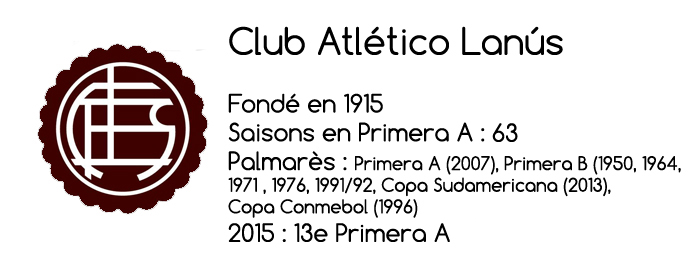 La reconstruction est aussi en partie au programme à Lanús qui a ainsi vécu la fin de l’ère dorée des frères Barros Schelotto. Si Guillermo s’en va tenter l’aventure en Italie, Gustavo reste aux côtés de Jorge Almirón pour assurer une certaine continuité. Peu de grandes modifications dans le groupe qui voit arriver la légende José Sand et assiste au retour de l’ancien Xeneize Pablo Mouche. Le Granate a pris pour habitude d’être un empêcheur de tourner en rond, il pourrait bien le rester en 2016.