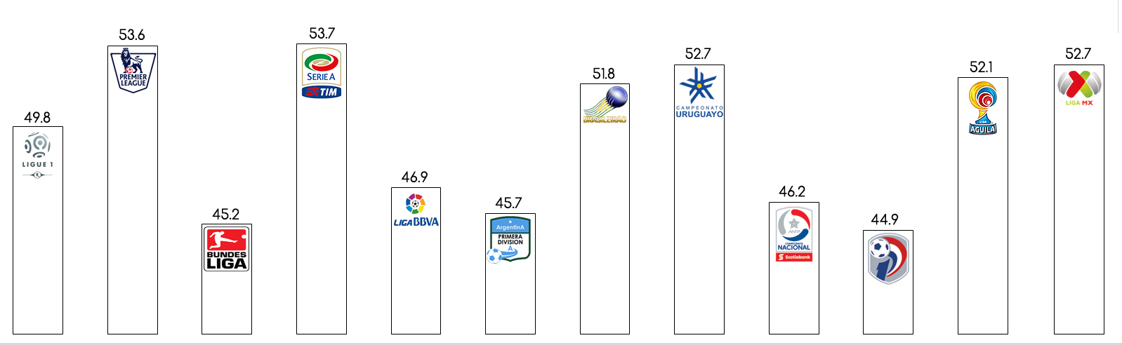 Moyenne d'âge des entraîneurs des principales premières divisions (de gauche à droite : France, Angleterre, Allemagne, Italie, Espagne, Argentine, Brésil, Uruguay, Chili, Paraguay, Colombie et Mexique)
