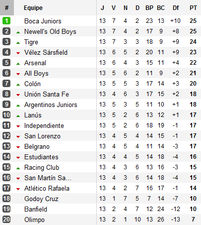 La treizième journée aura ouvert avec une énorme surprise, celle de la seconde défaite du tournoi pour Vélez, surpris chez lui par Argentinos. L’occasion était donc rêvée pour les autres concurrents au titre d’en profiter. Tigre n’hésitait pas et atomisait Unión Santa Fe. Dans la foulée, Newell’s arrachait un précieux succès à Bahia Blanca. A l’heure d’entrer sur la pelouse du Nuevo Monumental de Rafaela, Boca savait alors que toute défaite entraînerait la perte de la première place.
