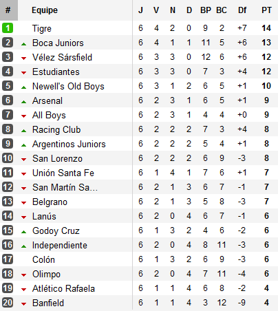 Loin de la tourmente, la lutte en haut du classement se poursuit et se resserre. Profitant du nul entre les deux leaders Tigre et Estudiantes, Boca est venu s'insérer entre eux après son nouveau court succès à San Martin alors que Vélez, a manqué l'opportunité de prendre la tête du classement en ne parvenant pas à assurer un succès sur le terrain d'Unión alors que le Fortin menait 3-1 à 25 minutes du terme. Conséquence, avant la septième journée de ce week-end, les quatre premiers se tiennent en deux points.