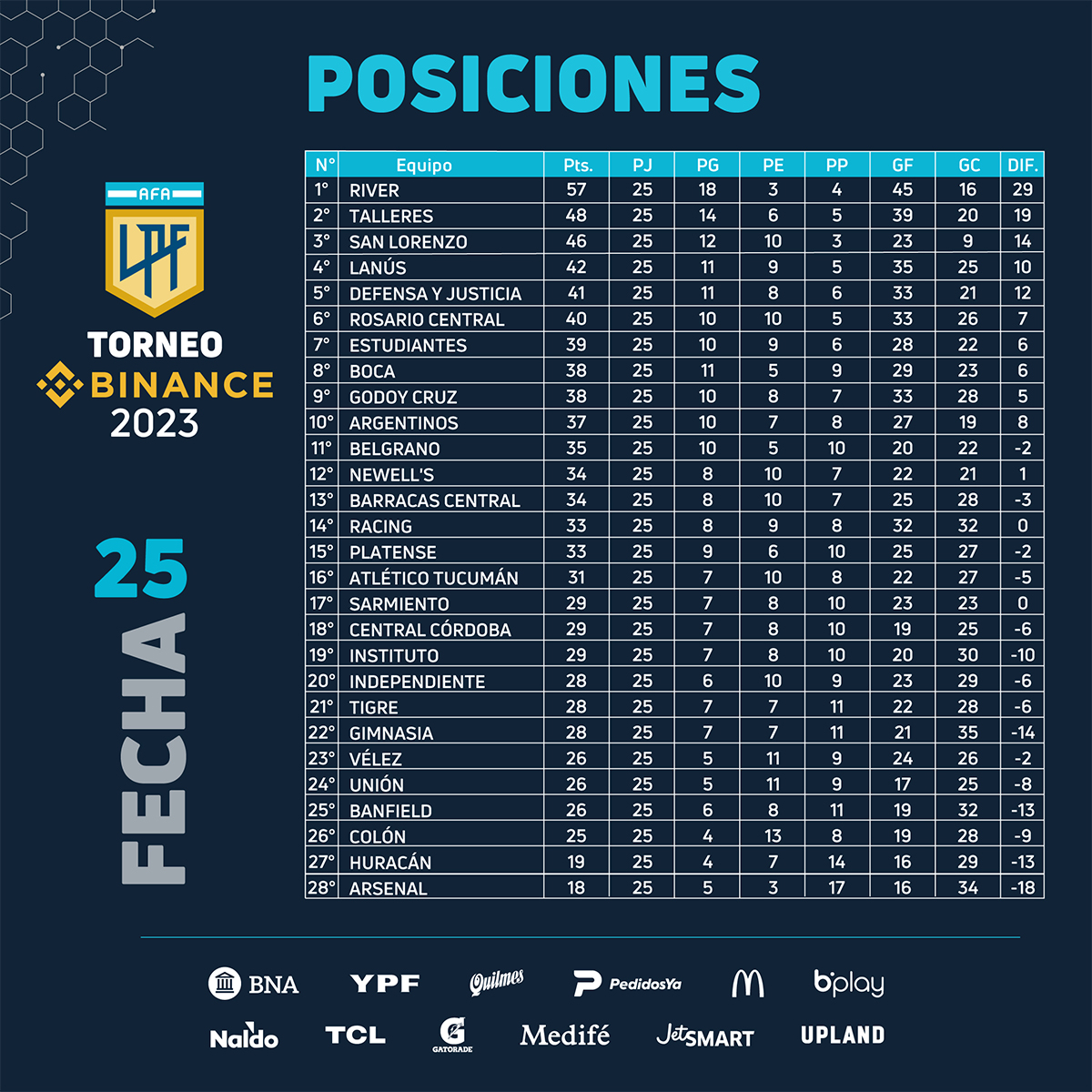 La consécration de River a été à l'image de sa saison : rapide et certaine. Les Millonarios n'avaient besoin que d'un match nul face à Estudiantes dans un Monumental des grands soirs. Il a fallu attendre seulement deux petites minutes pour voir le premier but de Beltrán, dix-huit pour le break de De la Cruz et trente-et-une pour le 3-0. River remporte donc son 38e titre de champion sans jamais avoir tremblé, tant le suspense a été inexistant cette saison. À noter la belle adaptation de Demichelis qui, après des débuts relativement difficiles en termes de jeu, a réussi à s'adapter et à proposer un jeu dynamique devenu efficace avec une régularité exemplaire. Le tout avec un effectif de grande qualité. Sans aucun doute, la meilleure équipe du championnat. À noter que le trophée n'a pas été délivré. Officiellement, la AFA attend la dernière journée à domicile. Officieusement, Chiqui Tapia est en vacances à Miami…