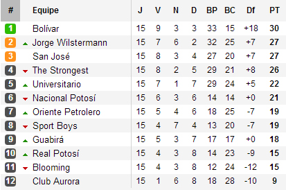 Mauvaise quinzième journée pour le leader Bolivar. En déplacement sur le terrain d’Oriente Petrolero pour l’un des Clásicos nationaux, les Celestes de La Paz sont tombés sur un but d’Alcides Peña peu avant l’heure de jeu. L’occasion est donc bonne pour le duo Wilstermann – San José. Le Santo pouvait revenir à hauteur en cas de succès face à The Strongest alors que l’Aviador pouvait revenir à trois points s’il s’imposait lors du Clásico cochabambino face à la lanterne rouge Aurora.