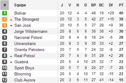 Leader après quinze journées, Bolívar est toujours devant à deux matchs de la fin. Mi-novembre, les Celestes ont résisté à la pression et enchainé les victoires (la dernière essentielle, à Oruro) pour se retrouver à quatre-vingt-dix minutes du titre. Pour cela, les hommes de Miguel Angel Portugal auront besoin de s’imposer ce week-end devant un Blooming dont le seul objectif sera de quitter l’avant dernière place. Un succès pourrait même offrir aux Celestes le titre avant la dernière journée. Car derrière, son seul concurrent pour le titre, l’ennemi The Strongest, se déplacera sur le terrain d’Oriente Petrolero, qui jouera une place en Sudamericana, et, avec un point de retard, n’aura donc pas droit à l’erreur.