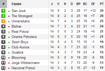 Meilleure attaque du tournoi grâce notamment à son buteur paraguayen Carlos Neumann (10 buts en 14 journées), el Santo San José de Oruro reste toujours seul leader. Pour cela, le vice-champion de l’Apertura 2012 a du enchainer quatre victoire consécutives depuis la défaite concédée face à son actuel dauphin, The Strongest, dont une dernière convaincante face à Sport Boys