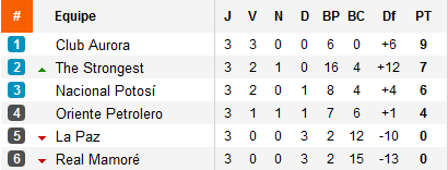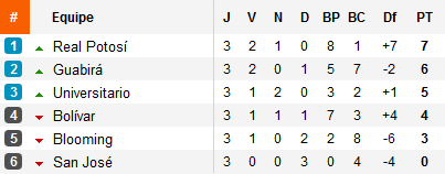 Car devant, Aurora assure tranquillement un 3 sur 3 en disposant ce mercredi du Nacional Potosí en match en retard de la première journée. Dans le groupe A, les leaders se nomment Real Potosí et Guabirá qui profitent de la première défaite de la saison de Bolivar sur le terrain de Blooming.