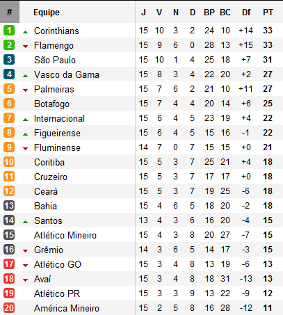 Après avoir retrouvé le goût de la victoire lors de la 14e journée face à la lanterne rouge América, les Corinthians ont de nouveau calé. Un premier résultat nul chez l’avant dernier Atlético Paranaense suivi d’un autre nul sans but concédé à Santos en match en retard de la 5e journée. 5 points lors des 5 dernières rencontres, il était inévitable que le leader du Brasileirão allait voir sa place menacée.