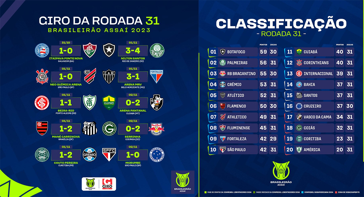 La trente-et-unième journée avait débuté par deux victoires à domicile sur la plus petite des marges, d’abord celle de Bahia face à Fluminense, qui avait aligné son équipe réserve en vue de la finale de la Copa Libertadores, puis celle du Corinthians contre l’Athletico Paranaense, Yuri Alberto profitant de la grossière faute de main de Bento pour marquer le but de la victoire. L’Internacional cède de son côté le match nul face à l’América Mineiro malgré le sixième but en cinq matchs d’Enner Valencia. Grâce à une victoire à l’extérieur contre Cuiabá, Vasco garde des espoirs de maintien, d’autant plus que le premier non-relégable, Cruzeiro, s’est incliné contre São Paulo, Luciano marquant en sortie de banc le seul but de la rencontre.