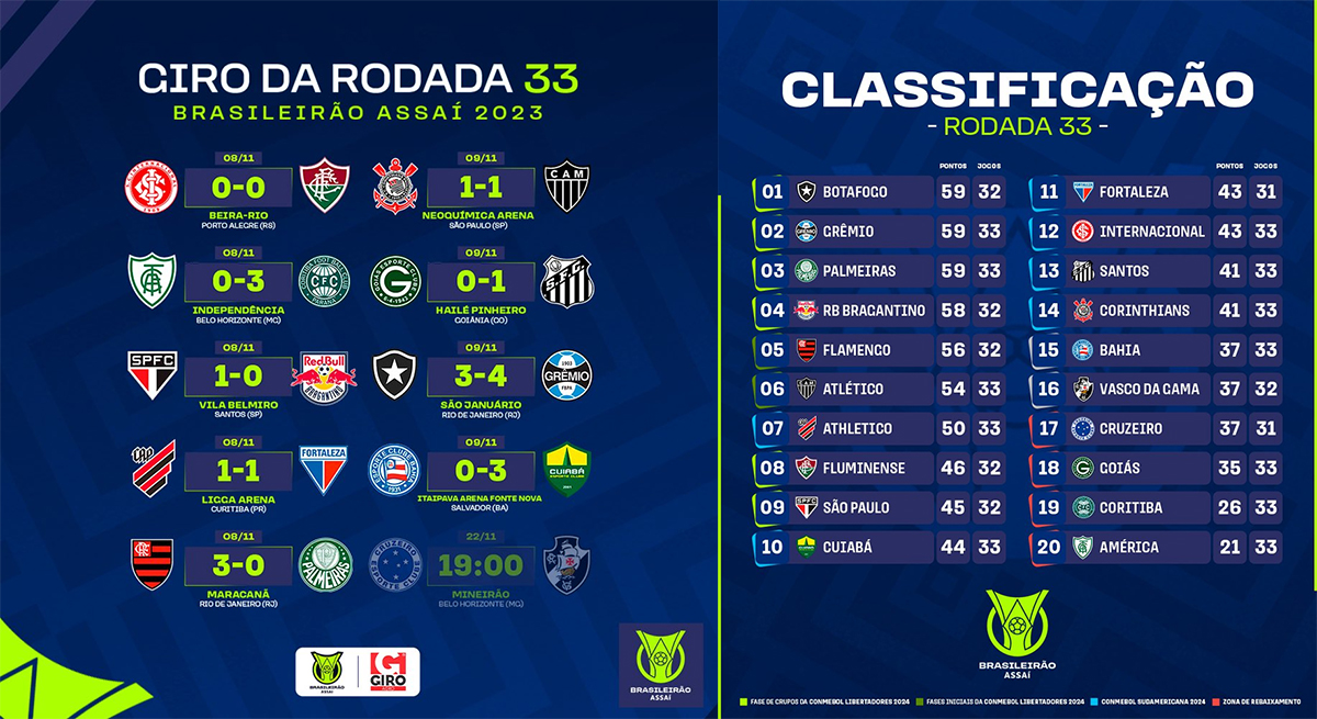 Dans un duel de (très) mal-classés, Coritiba s’impose largement sur le terrain de l’América Mineiro et condamne définitivement le Coelho, qui retrouve la Série B après deux saisons terminées dans la première partie de tableau du Brasileirão en 2021 et 2022. Pendant que l’Athletico Paranaense et Fortaleza partagent les points, Santos confirme son retour en forme avec une victoire sur la pelouse du relégable Goiás. Depuis le terrible 7-1 encaissé contre l’Internacional, le Peixe a pris onze des quinze derniers points possibles et se retrouve désormais virtuellement qualifié pour la Copa Sudamericana ! Enfin, Cuiabá s’impose facilement sur la pelouse de Bahia alors que le dernier match de la journée aura lieu le 22 novembre, un match extrêmement important entre le dernier non-relégable Vasco et le premier relégable Cruzeiro, les deux équipes ayant trente-sept points.