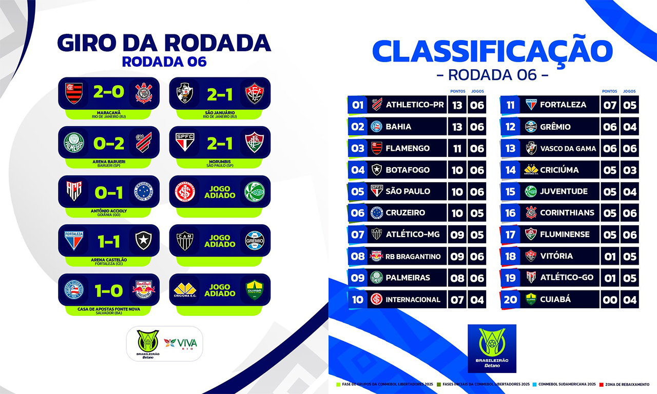 En ouverture de la sixième journée, Flamengo reçoit le Corinthians et s’impose 2-0 grâce à un grand match de Lorran, dix-sept ans, auteur d’une passe décisive pour l’ouverture du score de Pedro avant de marquer le but de la victoire d’une frappe ajustée pied gauche (à lire dans l’inside de la semaine). Privé de l’Allianz Parque en raison d’un concert, Palmeiras reçoit le leader l’Athletico Paranaense à l’Arena Barueri et pense bien commencer le match, Endrick forçant le gardien Bento à commettre un penalty. Le gardien néo-international se rattrape en détournant le penalty de Raphael Veiga et lance l’Athletico Paranaense vers un succès, concrétisé grâce à un coup franc de Pablo et un but contre son camp de Gustavo Gómez. Grâce à ce succès sur Palmeiras, le Furacão reste leader, à égalité de points avec Bahia. Porté par le duo Éverton Ribeiro – Cauly, Bahia s’impose sur la plus petite des marges, Thaciano fêtant idéalement ses vingt-neuf ans en marquant le but de la victoire. Le G-4 est fermé par Botafogo, qui obtient le match nul sur la pelouse de Fortaleza dans un match où les deux équipes ont reposé leurs cadres en vue des prochaines échéances.