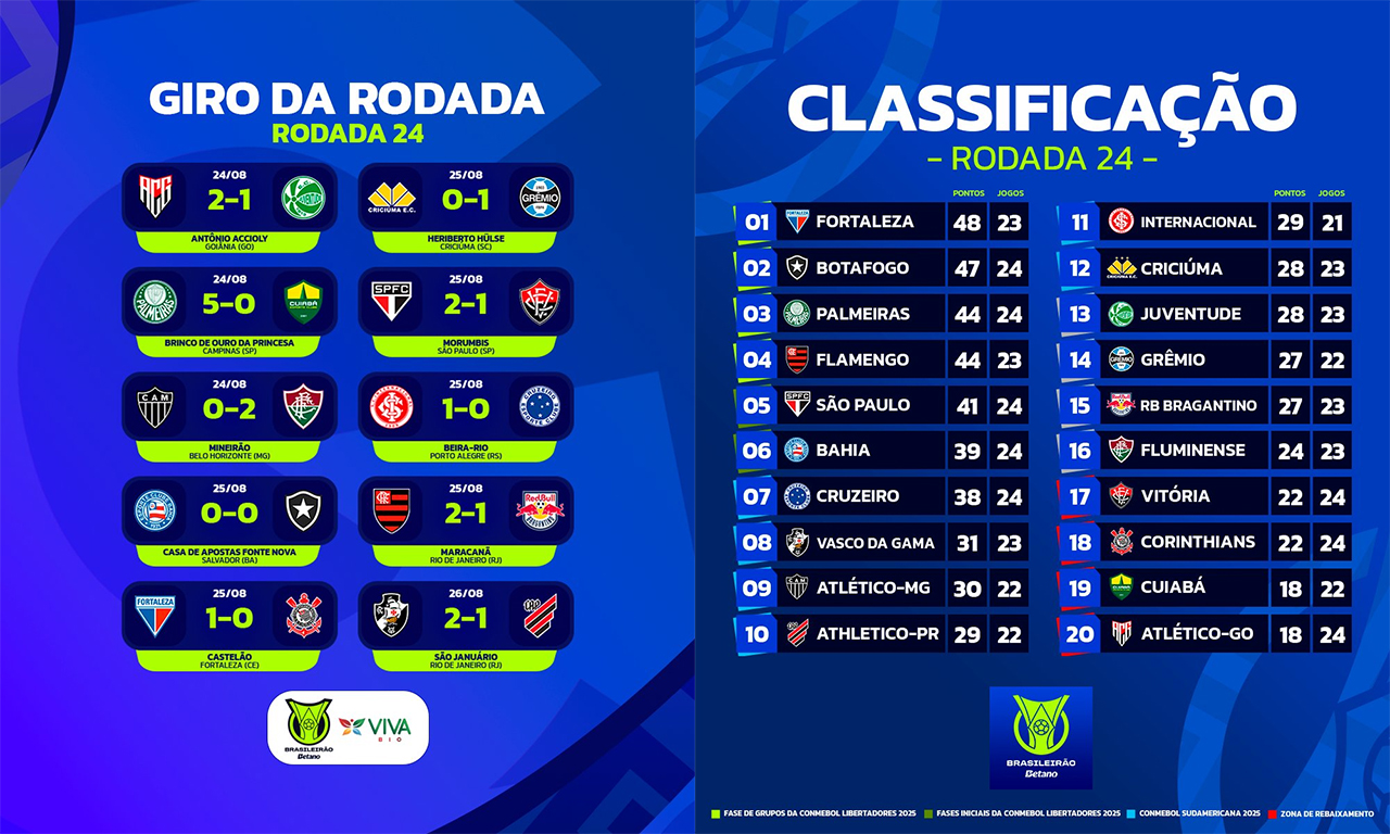 La vingt-quatrième journée débute par une nouvelle victoire de l’Atlético-GO, grâce à un penalty à la dixième minute du temps additionnel, inscrit par Alejo Cruz. Encore lanterne rouge, le Dragão décroche un deuxième succès consécutif et se remet à croire à un maintien inespéré. De son côté, Palmeiras déroule avec une victoire 5-0 sur Cuiabá, grâce à un exceptionnel Estevão, auteur de deux buts et deux passes décisives. À dix-sept ans, le crack déjà vendu à Chelsea porte ses statistiques à sept buts et sept passes décisives en vingt matchs dans le Brasileirão et vise désormais le record de Neymar, décisif à seize reprises (dix buts et six passes décisives) au cours du Brasileirão 2009, lorsqu’il était encore mineur.