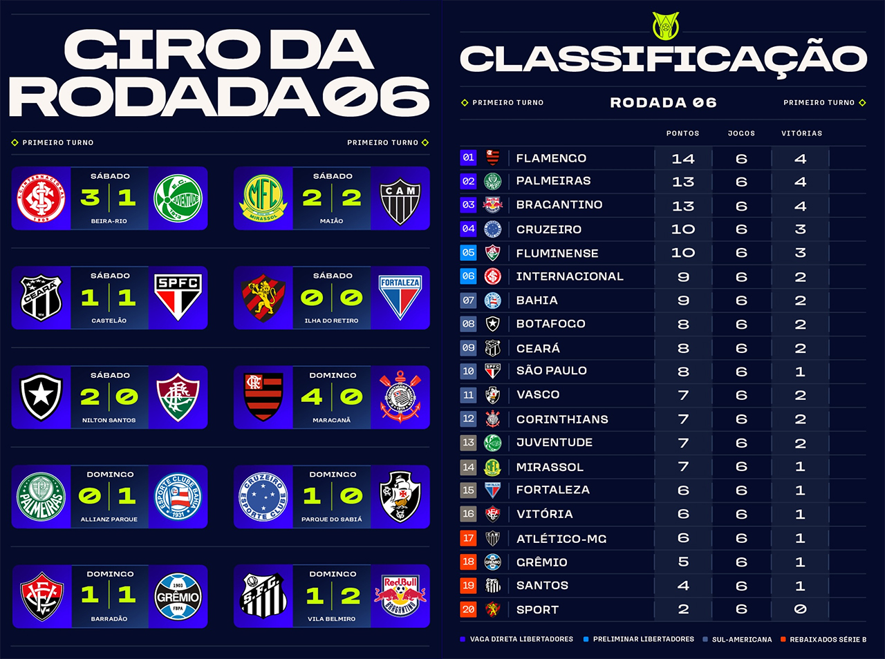 La sixième journée débute par le clássico Juvenal entre l’Internacional et Juventude, qui ouvre rapidement le score. La suite du match est marquée par le talent d’Alan Patrick, auteur de trois passes décisives sur corner ! Le club colorado s’impose 3-1 et grimpe de six places au classement pour faire son entrée dans le G-6. L’Atlético Mineiro continue de décevoir en ce début de saison et cède deux points précieux sur le terrain de Mirassol en encaissant un but dans le temps additionnel de Reinaldo, déjà auteur de quatre buts dans le Brasileirão. Pour sa première saison dans l’élite, Mirassol réalise des débuts honnêtes avec quatre matchs nuls et une seule défaite. Le record de matchs nuls de ce Brasileirão appartient cependant à São Paulo, qui connaît face à Ceará sa cinquième égalité en six matchs ! Le Tricolor est toujours invaincu dans le championnat, mais avance doucement, avec huit points et une place en milieu de tableau. Autre match nul, celui entre Sport et Fortaleza, match marqué par une polémique, le ballon semblant avoir franchi entièrement la ligne de but de Sport sur la frappe de Yago Pikachu. Sport évite ainsi une nouvelle défaite, mais reste lanterne rouge du championnat.