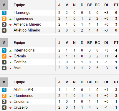 Dans le championnat gaúcho, le Grêmio (quatre victoires et une défaite) et l'Internacional (trois victoires et deux nuls) sont satisfaisants. Toutefois, ce n'est pas suffisant pour accrocher la première place puisque le Juventude (cinq victoires en cinq matchs) et São José (quatre victoires et un match nul) restent en tête dans un championnat où les cinq premiers ont fait le trou et se tiennent en quatre points.