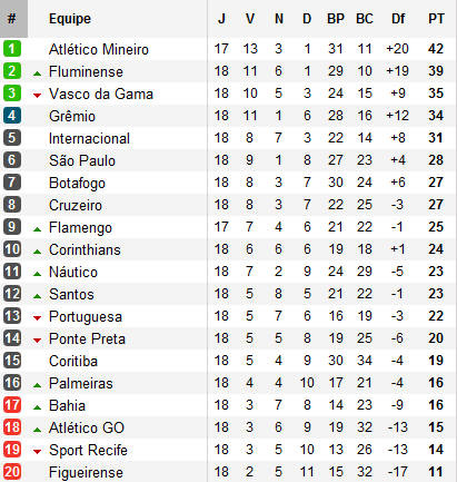 Un mois et sept matchs plus tard, le Galo maintient son rythme effréné, bien imité par le Flu. Quatre victoires, deux nuls, les hommes de Cuca dominent toujours la Serie A. Derrière eux, Fluminense rend une copie quasi-identique et se retrouve désormais second, toujours à trois points. Attention cependant, le Galo compte une rencontre de plus à disputer face à Flamengo le 26 septembre prochain.