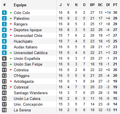 Première de toute : qui décrochera sa place en Sudamericana ? Actuel leader après son succès sur la pelouse d’Antofagasta, Colo Colo reste maitre de son destin. Un succès lors de l’ultime journée ce week-end lui offrira la Sudamericana. Mais la menace est réelles : car derrière, Palestino et Rangers, tombés le week-end dernier, ne sont qu’à un point, Iquique et la ‘U’ à trois (l’Universidad de Chile comptant même un match de retard à disputer). Rien n’est donc assurés pour les Albos si ce n’est une place en play-offs.