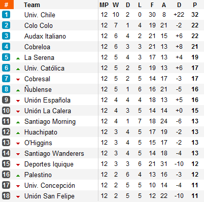 Colo Colo n'avance donc plus (deuxième défaite 0-4 consécutive) et voit de son côté Audax Italiano revenir à sa hauteur après son succès sur le terrain d’O’Higgins. A noter enfin la seconde victoire du tournoi pour Palestino qui quitte ainsi la dernière place.