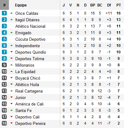 A noter la seconde défaite de Tolima qui encaisse de nouveau un 3-1, cette fois-ci devant Independiente et pointe désormais à sept points d’Once Caldas. Los Blancos seuls en tête devraient profiter de la septième journée pour conforter leur place de leader : alors qu’Itagüí Ditaires se déplacera sur le terrain de Millonarios, le leader accueillera la lanterne rouge.