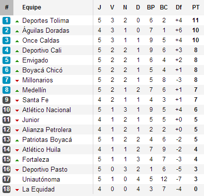 Le haut du classement est donc trusté par les surprises. Tolima et Águilas Doradas encore invaincus sont aux deux premières places. Le Deportes Tolima, champion une seule fois (en 2003), mène actuellement la course avec un point d’avance sur la surprise Águilas Doradas. Viré d’Itagüí un soir de dispute entre le maire et le propriétaire du club, l’ancien Itagüí Ditaires, depuis devenu Águilas Doradas, et son duo Fano – Palomino, écrase tout sur son passage. Tout en bas, signalons enfin le départ catastrophique de La Equidad avec quatre défaites en autant de rencontres disputées.