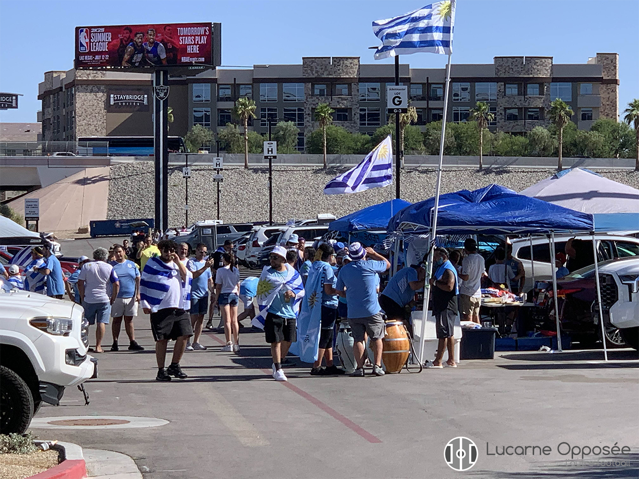 Les gradins ne se remplissaient pas totalement. Le prix prohibitif des places (plus de 250 USD pour une place en milieu de tribunes latéral en prévente) y est pour quelque chose. De plus, les températures caniculaire ce jour-là pour arriver au stade ont forcément eu un impact sur le remplissage du stade, le mercure dépassant largement les quarante-cinq degrés. Heureusement que le stade a un toit et dispose de la climatisation pour permettre la tenue de l’évènement dans des conditions optimales pour les acteurs et les spectateurs. Au final, l’Allegiant Stadium accueillait 50 770 personnes ce soir-là sur un maximum de 65 000. Les supporters de la Celeste représentaient la majorité des spectateurs, mais des supporters du Brésil, plus des fans américains des stars brésiliennes que des supporters de la sélection auriverde, étaient également présents.