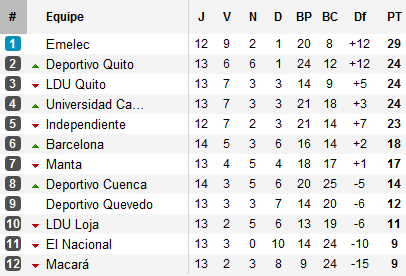 Si Emelec peut tout de même compter sur un match de plus à disputer, la réduction de l’avance pourrait faire naître quelque pression, la fatigue de la Libertadores venant vraisemblablement s’ajouter au tout. Derrière, les deux clubs de Quito s’accrochent : le Deportivo s’appuie sur l’excellent Federico Nietto (9 buts en 12 matchs) pour rester dans le coup, alors que la LDU, freinée par un Barcelona pourtant hors du coup, devra se remettre en marche sous peine de décrocher définitivement.